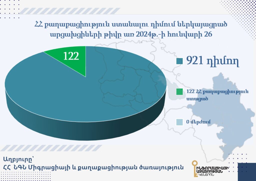 ՀՀ Ներքին գործերի նախարարության Միգրացիայի և քաղաքացիության ծառայության տվյալների համաձայն՝ ՀՀ քաղաքացիություն ստանալու համար հունվարի 26-ի դրությամբ դիմել է 921 Արցախի քաղաքացի։ ՀՀ նախագահի հրամանագրով նույն օրվա դրությամբ ՀՀ քաղաքացիություն է շնորհվել 112 անձի, մերժում չի եղել։