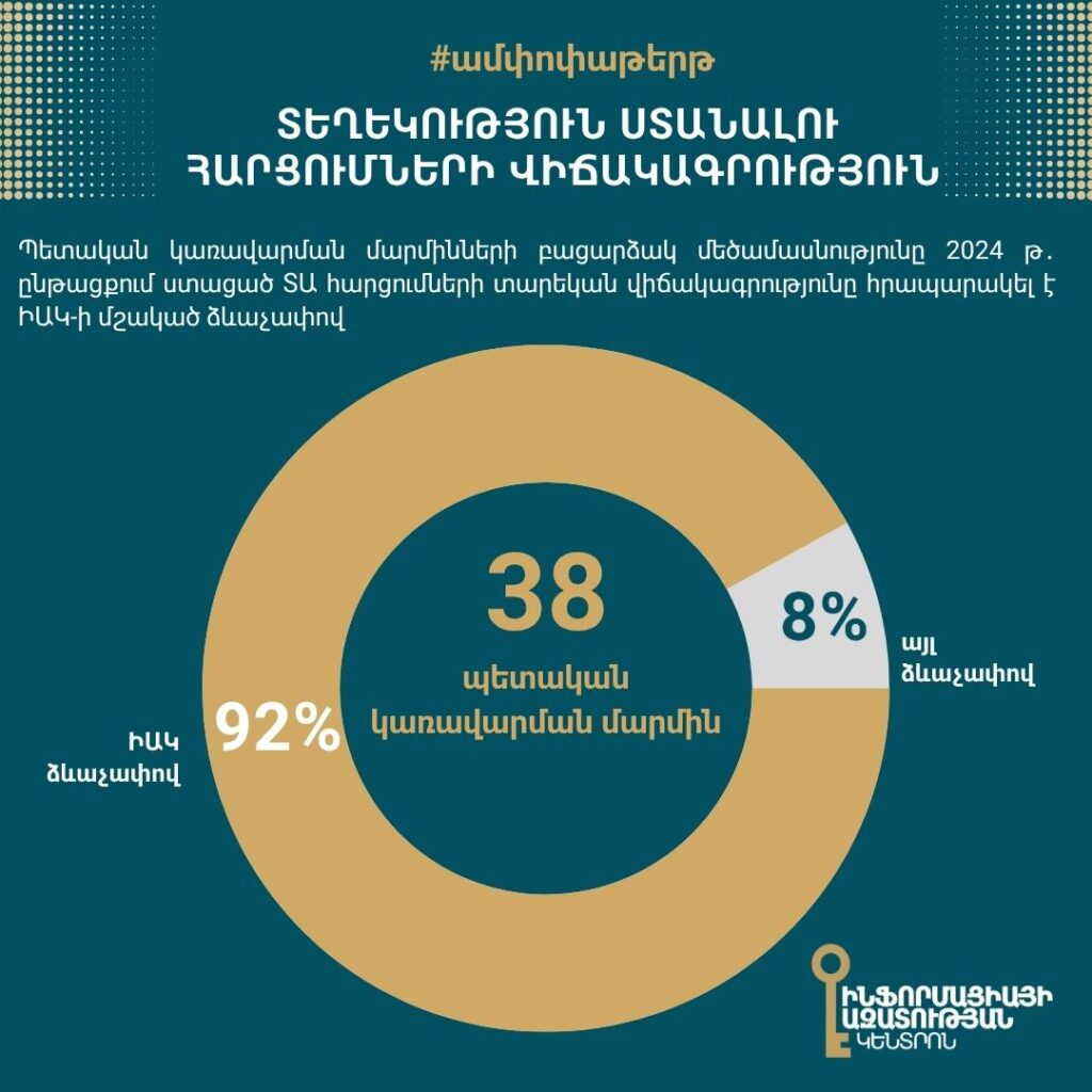 Public administration bodies have published their 2024 annual statistics on freedom of information (FOI) requests using the template developed by the Freedom of Information Center of Armenia (FOICA). As of October 4, 2025, all observed state bodies had published their annual FOI request statistics.