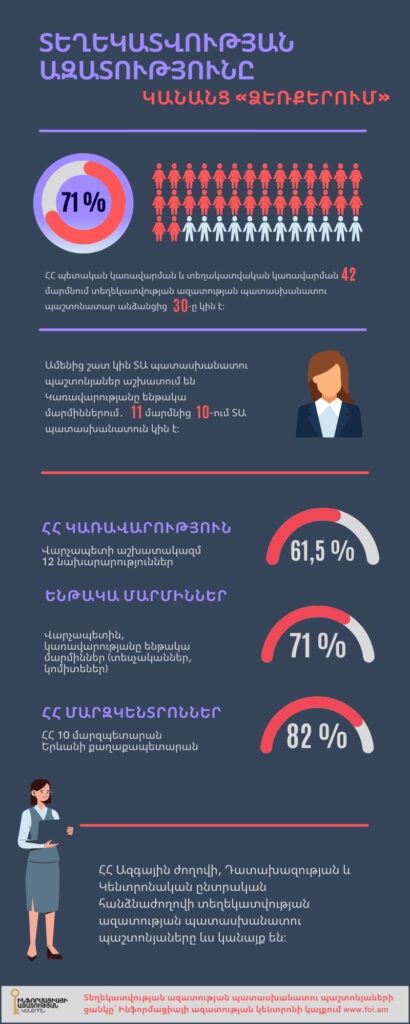 ՀՀ պետական կառավարման և տեղակատվական կառավարման 42 մարմնում տեղեկատվության ազատության պատասխանատու պաշտոնատար անձանցից 30-ը կին է։