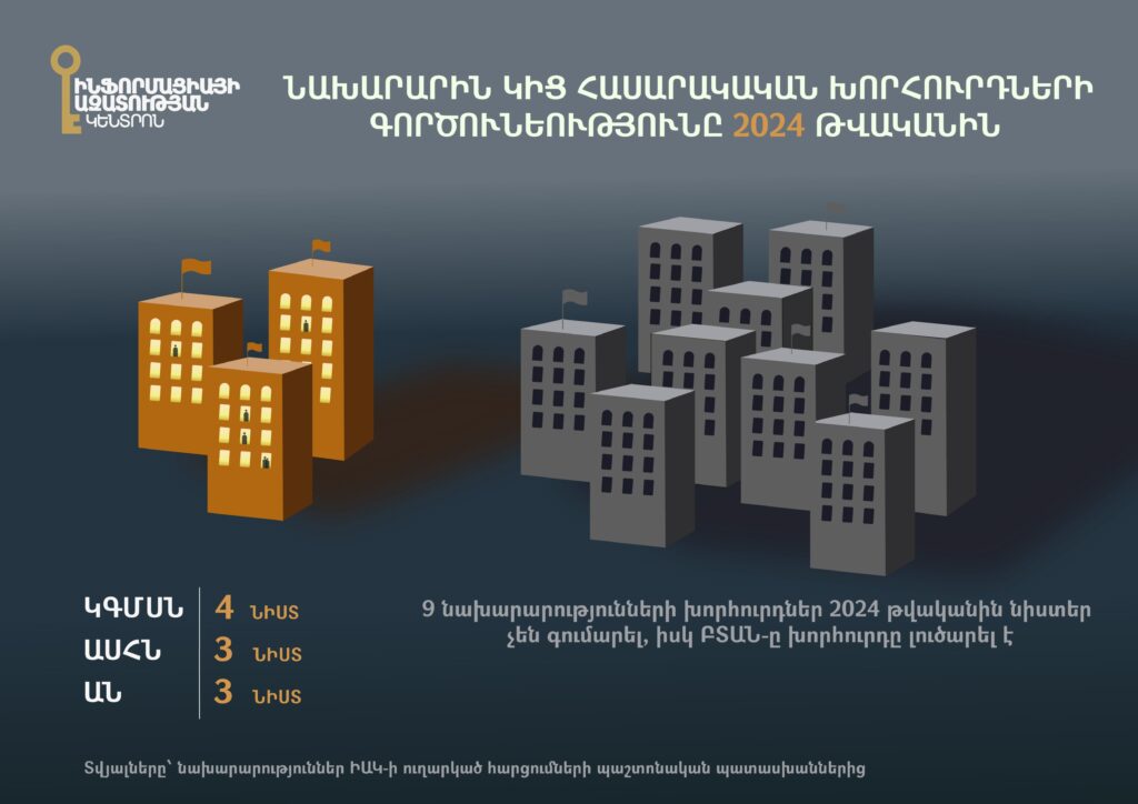 Հարցումների պատասխաններից պարզ է դառնում, որ 2024թ․-ին 12 նախարարություններց միայն երեքում (ԱՍՀՆ, ԿԳՄՍՆ, Առողջապահության նախարարություն) են փաստացի գործել Նախարարին կից հասարակական խորհուրդները, որոնք նախորդ տարվա ընթացքում նիստեր են գումարել։